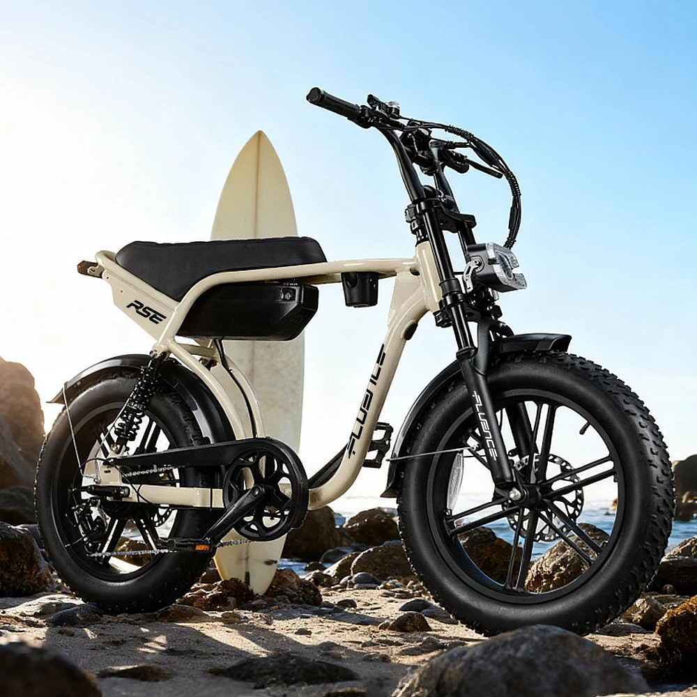 The Fluence RSE Fat Tire Electric Bike has powerful performance and climbs hills with ease. Its extended seat can easily accommodate two people, and the personalized headlight makes you stand out. The 20×4.0 wide tires provide strong grip on sand, snow or urban gravel roads.